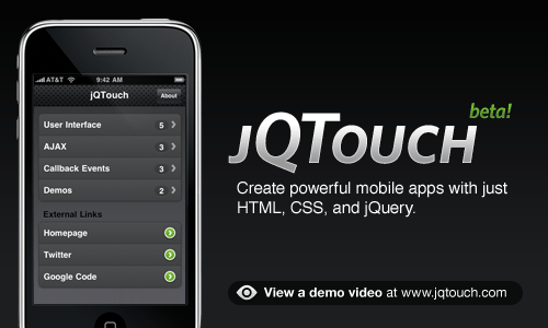 The beta has new themes and demos, support for new events, including swipe detection and page transitions, and new options for fullscreen mode, including icon and startup screen. jQTouch is written in HTML5, CSS3, and jQuery. Check out the demo video to see it in action!