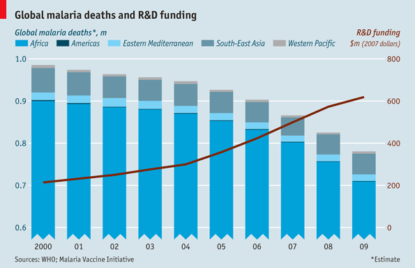 Daily chart: global malaria deaths. The death toll from malaria seems to have responded to a big injection of money. Over the past decade deaths have fallen by 20%; of 108 countries where malaria is endemic, ten are on track to eliminate the disease in the near future.