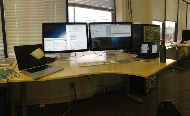 My setup at isocket: two 27" Thunderbolt displays powered by a 13" Retina MacBook Pro. The other MacBook Pro is for testing a new project I’m spearheading.